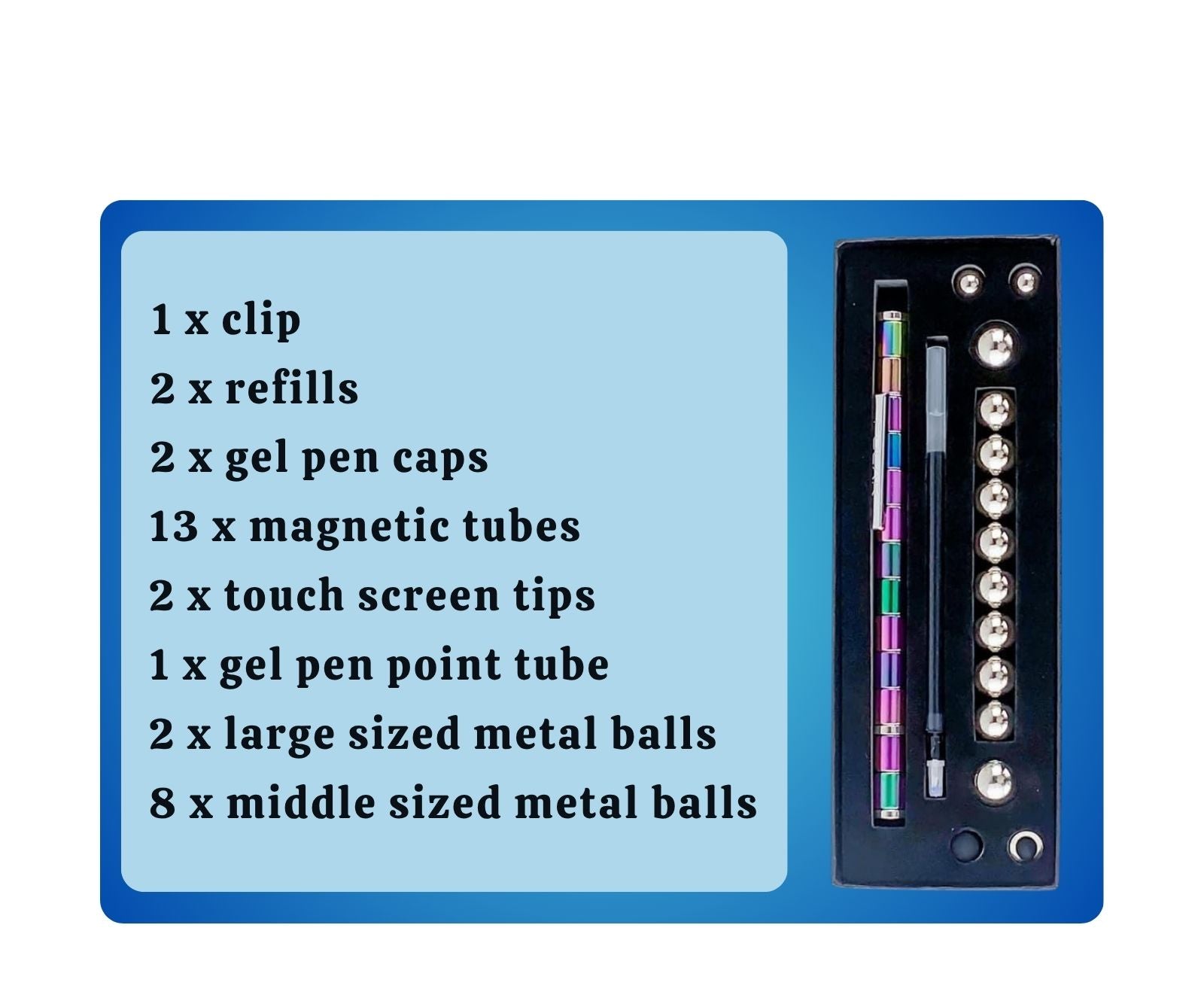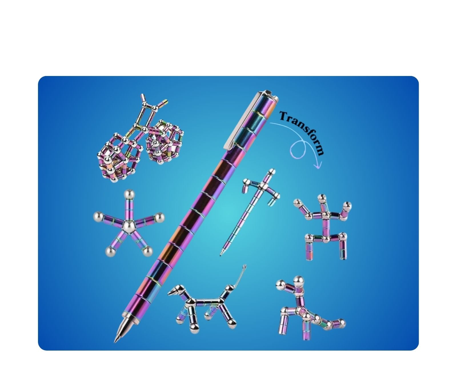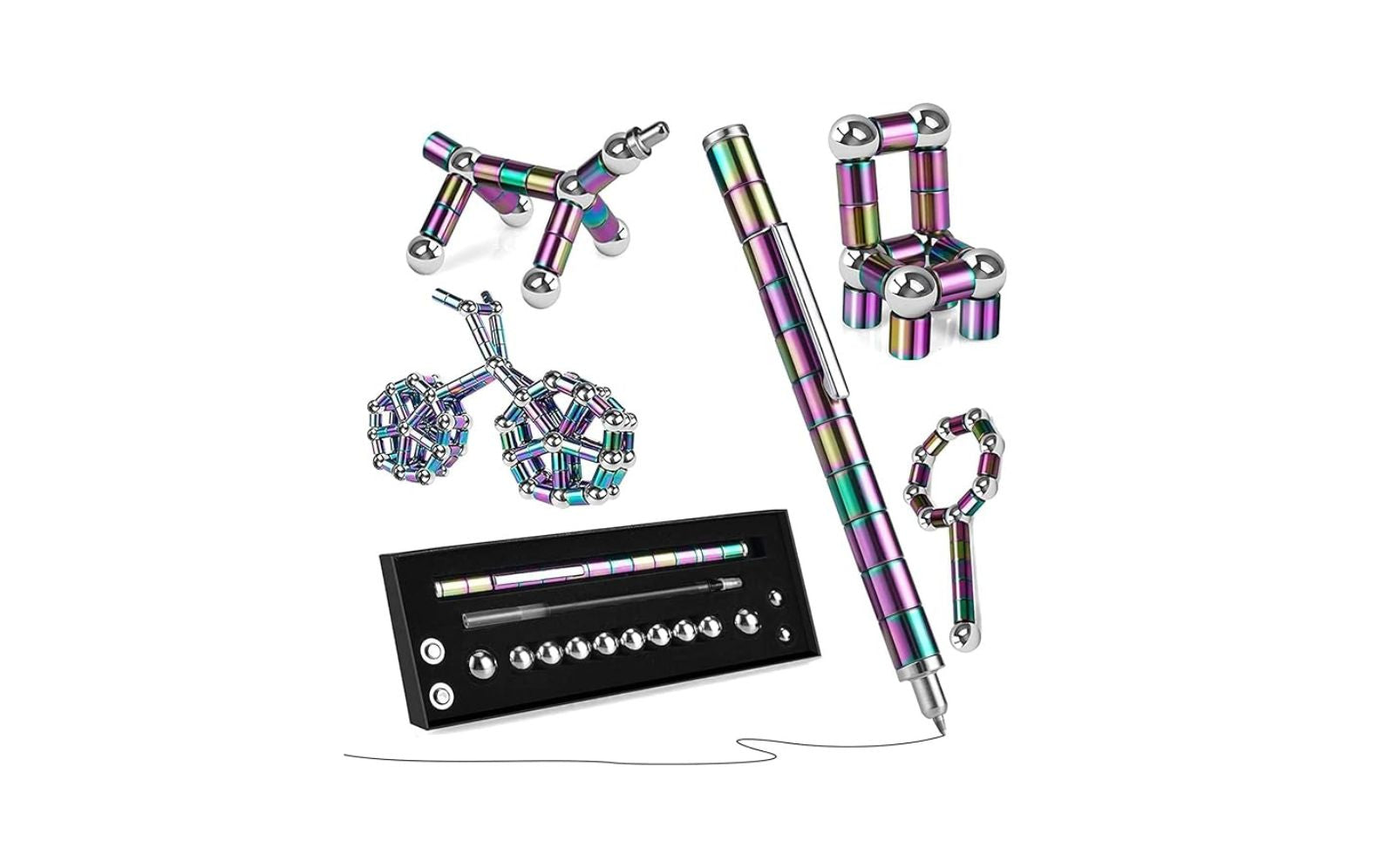 It’s a multifunctional pen that combines writing and stress relief. The magnetic parts can be twisted, shaped, or spun to help focus or relax while still functioning as a regular ballpoint pen.